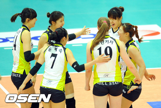 현대건설은 25일 대전충무체육관에서 열린 '2011-2012 NH농협 V리그' 5라운드 마지막 KGC인삼공사와 원정경기에서 세트 스코어 3-2(19-25 25-20 26-28 25-19 15-11) 짜릿한 역전승을 거뒀다. 브란키차(26점)-황연주(23점)가 49점을 합작하며 팀 승리를 견인했다.