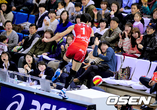 26일 오후 천안 유관순체육관서 열린 '2011-12시즌 NH농협 V리그' 현대캐피탈과 LIG 손해보험과의 경기 2세트 LIG 주상용이 공을 살리기 위해 관중석으로 돌진하고 있다.
