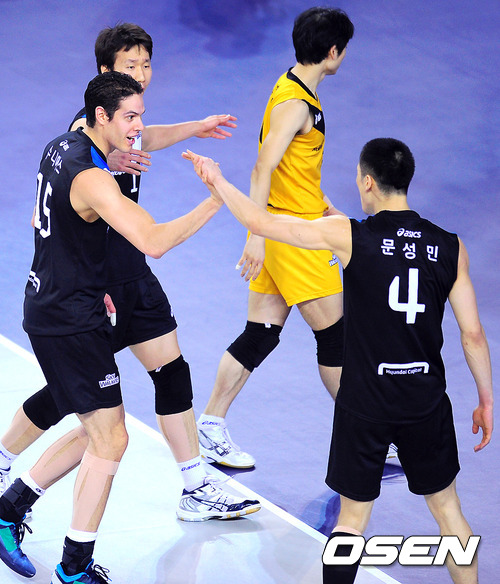 26일 오후 천안 유관순체육관서 열린 '2011-12시즌 NH농협 V리그' 현대캐피탈과 LIG 손해보험과의 경기 1세트 종료후 현대캐피탈 수니아스와 문성민이 하이파이브를 하고 있다