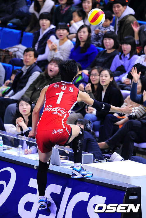 2세트 LIG 주상용이 공을 살리기 위해 광고판을 밟고 있다. /soul1014@osen.co.kr