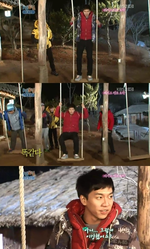 26일 방송된 KBS 2TV ‘해피선데이-1박2일’ 전북 정읍 2탄에서 이승기는 베이스캠프 마당에 걸려있는 대형 그네타기에 도전했다. 쉬운 도전이었지만 이승기는 의외로 타지 못하는 모습으로 큰 웃음을 줬다.