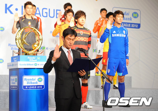 27일 오전 서울 홍은동 그랜드힐튼호텔에서 진행된 '2012 K리그 개막 미디어데이'에서 서울 최용수 감독이 축구인 헌장 선서를 하고 있다.