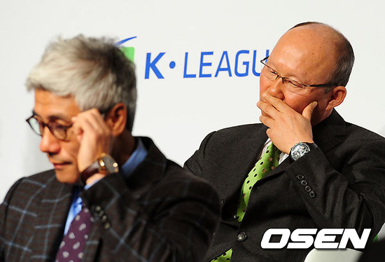 27일 오전 서울 홍은동 그랜드힐튼호텔에서 진행된 '2012 K리그 개막 미디어데이'에서 상주 박항서 감독(오른쪽)과 제주 박경훈 감독이 생각에 잠겨 있다.