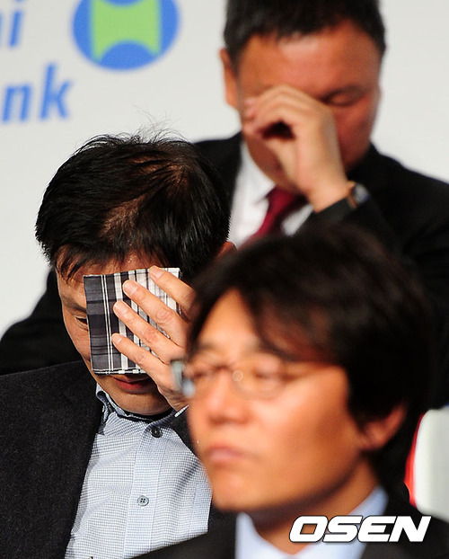 27일 오전 서울 홍은동 그랜드힐튼호텔에서 진행된 '2012 K리그 개막 미디어데이'에서 경남 최진한 감독이 땀을 닦고 있다.