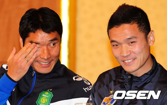 27일 오전 서울 홍은동 그랜드힐튼호텔에서 진행된 '2012 K리그 개막 미디어데이'에서 전북 정성훈이 득점왕 욕심을 피력했으나 인천 김남일이 정성훈이 아닌 이동국을 득점왕 후보로 지목하자 당황한 표정을 짓고 있다.