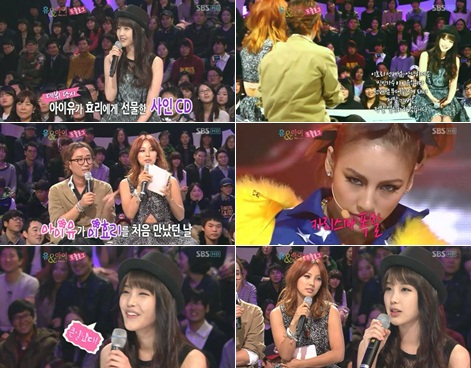 지난 26일 오후 12시 방송된 SBS 음악프로그램 '유앤아이'에 게스트로 출연한 아이유는 "신인 때 이효리 선배를 본 적이 있다. 사인을 남긴 CD를 이효리 선배에게 줬다"고 말했다.