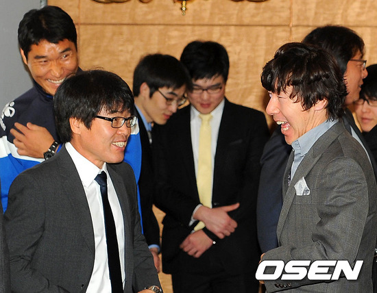 27일 오전 서울 홍은동 그랜드힐튼호텔에서 진행된 '2012 K리그 개막 미디어데이'에서 전북 정성훈과 성남 신태용 감독이 웃으며 이야기를 나누고 있다.