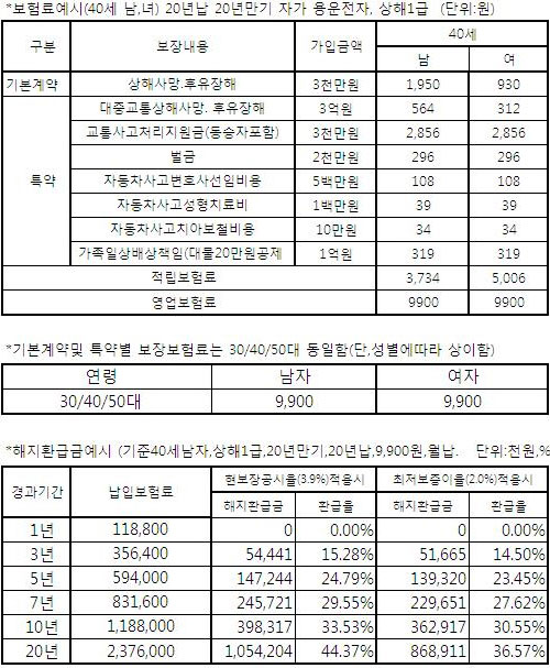 - 상기 예상해지환급률은 적립부분 순보험료(적립부분 영업보험료에서 회사운영경비를 차감한 금액)를 이 계약의 공시이율(2011.6월 현재 4.2%, 단 2년이내 해지시 중도해지이율 )로 적립산출한 것으로 향후 이 계약의 공시이율, 계약내용변경, 보험료 실납입일 등에 의해 변동될수 있음, 단, 최저보증이율 : 연복리 2.0%- 위 예시된 해지환급금은 미래의 수익을 보장하지 않음.- 해지환급금은 납입한 금액보다 적거나 없을 수도 있음.- 교통사고처리지원금(동승자포함), 벌금, 자동차사고변호사선임비용 특약은 음주, 무면허, 도주시