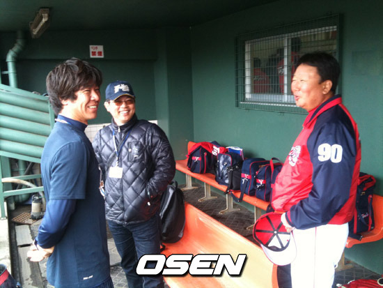 야쿠르트 임창용이 지난 27일 연습경기에 앞서 KIA 덕아웃을 찾아 선동렬 감독과 양상문 MBC 스포츠 해설위원과 이야기를 나누고 있다.