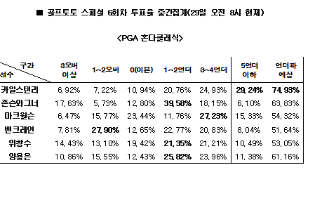 카일스탠리에 이어 존슨와그너(63.83%), 양용은(61.16%), 마크윌슨(54.32%), 위창수(53.05%), 벤크레인(51.64%) 등 대상선수들 모두 1라운드 언더파 활약을 펼칠 것으로 예상됐다.