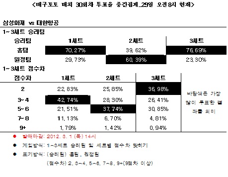 1~3세트 승리팀과 점수차를 맞히는 배구토토 매치 게임에서 세트별 예상 승리팀은 1세트(70.27%)는 삼성화재, 2세트(60.39%)는 대한항공, 3세트(76.69%)는 삼성화재로 나타났다.