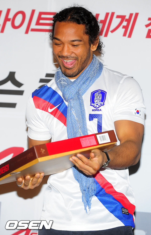 29일 오후 서울 상암동 상암월드컵경기장 내 상암CGV에서 열린 UFC 라이트급 챔피언 벤 헨더슨 기자회견에서 벤 헨더슨이 인삼 선물을 받고 있다