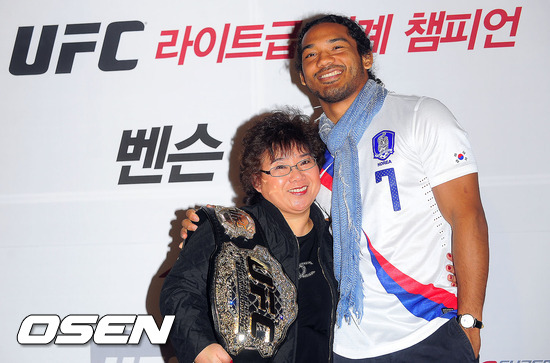 29일 오후 서울 상암동 상암월드컵경기장 내 상암CGV에서 열린 UFC 라이트급 챔피언 벤 헨더슨 기자회견에서 벤 헨더슨이 어머니 김성화씨와 포즈를 취하고 있다.