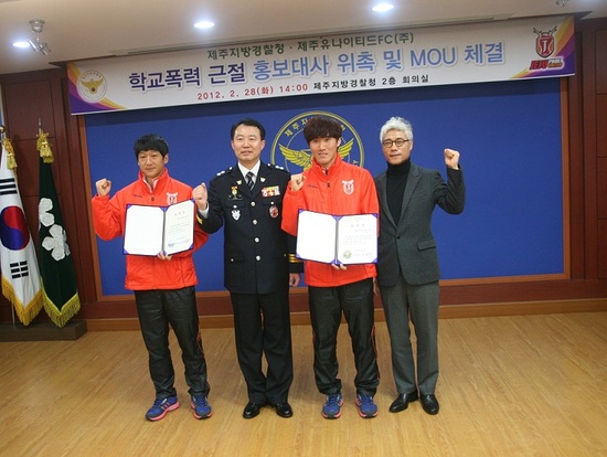 제주는 28일 제주지방경찰청 2층 회의실에서 제주지방경찰청과 학교폭력 근절 홍보대사 위촉 및 업무협약(MOU)을 체결했다. 따라서 제주는 앞으로 제주지방경찰청과 긴밀한 협조를 통해 학교폭력 근절 분위기 조성과 비행 청소년 선도 및 보호 활동에 적극 동참할 예정이다.