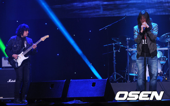 29일 오후 서울 광장동 악스코리아에서 진행된 '제9회 한국대중음악상 시상식'에서 그룹 게이트플라워즈와 신대철이 화려한 오프닝 무대를 펼치고 있다.