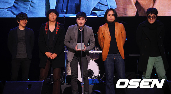 29일 오후 서울 광장동 악스코리아에서 진행된 '제9회 한국대중음악상 시상식'에서 최우수 록 노래,음반상을 수상한 그룹 장기하와 얼굴들이 수상소감을 말하고 있다.