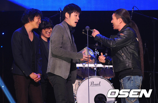 29일 오후 서울 광장동 악스코리아에서 진행된 '제9회 한국대중음악상 시상식'에서 최우수 록 음반상을 수상한 그룹 장기하와얼굴들의 장기하가 시상자 크래쉬의 안흥찬에게 왕관을 받고 있다.