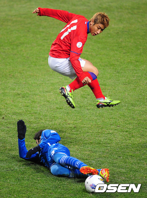 29일 오후 서울월드컵경기장에서 열린 2014 브라질월드컵 아시아지역 3차예선 최종전 대한민국과 쿠웨이트의 경기, 전반 한국 이근호가 쿠웨이트의 수비수의 태클을 피하고 있다.