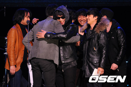 29일 오후 서울 광장동 악스코리아에서 진행된 '제9회 한국대중음악상 시상식'에서 올해의 음악인상을 수상한 그룹 장기하와얼굴들이 시상자 갤럭시익스프레스의 축하를 받고 있다.