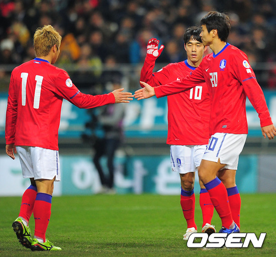 29일 오후 서울월드컵경기장에서 열린 2014브라질월드컵 아시아지역 3차예선 최종전(6차전) 대한민국과 쿠웨이트의 경기 전반 이동국과 이근호, 박주영이 골찬스를 놓친후 파이팅을 하고 있다.