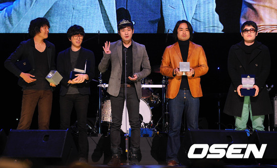 29일 오후 서울 광장동 악스코리아에서 진행된 '제9회 한국대중음악상 시상식'에서 올해의 음반상을 수상한 그룹 장기하와 얼굴들이 수상 소감을 말하고 있다.