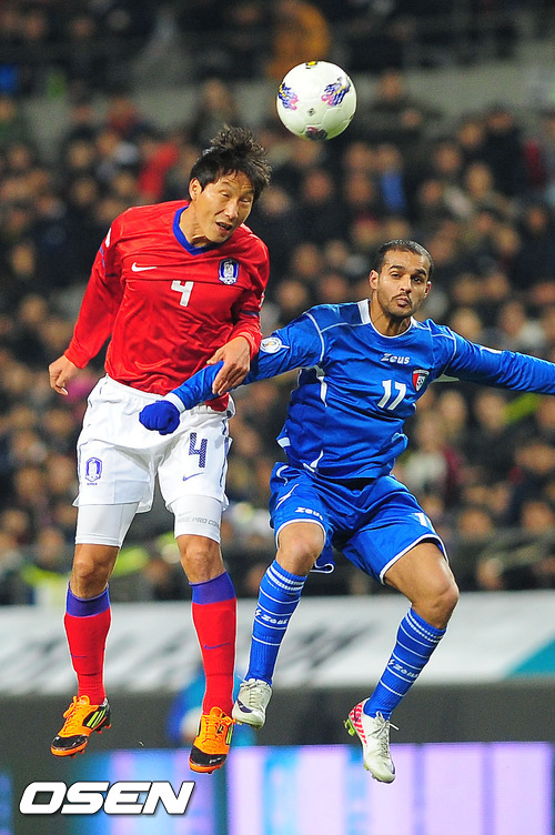 [OSEN=민경훈 기자, 서울월드컵경기장] 29일 오후 서울월드컵경기장에서 열린 2014브라질월드컵 아시아지역 3차예선 최종전(6차전) 대한민국과 쿠웨이트의 경기 전반 한국 김상식이 공중볼을 받아내고 있다.