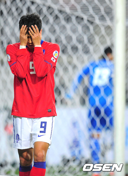 29일 오후 서울월드컵경기장에서 열린 2014브라질월드컵 아시아지역 3차예선 최종전(6차전) 대한민국과 쿠웨이트의 경기 전반 한상운이 골찬스를 놓친 후 아쉬워하고 있다.