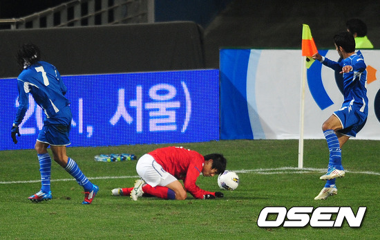 29일 오후 서울월드컵경기장에서 열린 2014 브라질월드컵 아시아지역 3차예선 최종전 대한민국과 쿠웨이트의 경기, 전반 한국 박원재가 쿠웨이트 수비수가 걷어낸 볼에 머리를 맞고 있다.