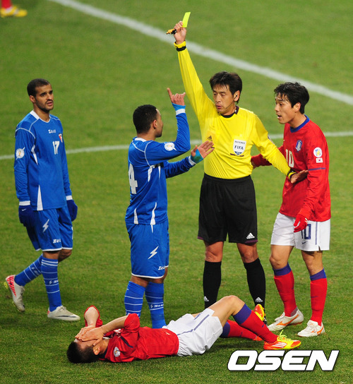 29일 오후 서울월드컵경기장에서 열린 2014 브라질월드컵 아시아지역 3차예선 최종전 대한민국과 쿠웨이트의 경기, 전반 한국 김두현이 공중볼을 다투다 넘어지자 박주영이 주심에 항의하고 있다.