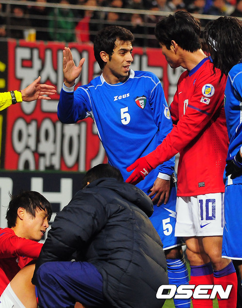 29일 오후 서울월드컵경기장에서 열린 2014브라질월드컵 아시아지역 3차예선 최종전(6차전) 대한민국과 쿠웨이트의 경기 전반 박원재가 얼굴에 공을 맞은 뒤 고통스러워하고 있다.박주영이 쿠웨이트 수비수에게 제스쳐를 취하고 있다