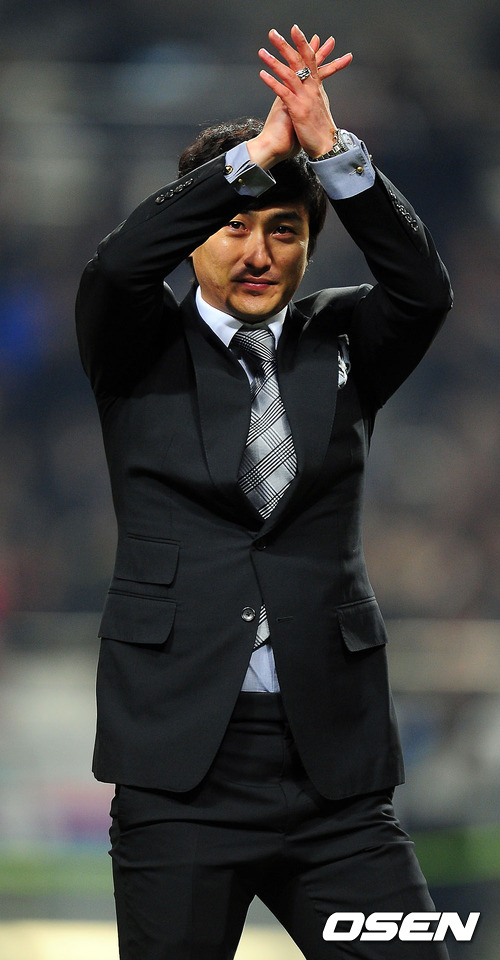 29일 오후 서울월드컵경기장에서 열린 2014브라질월드컵 아시아지역 3차예선 최종전(6차전) 대한민국과 쿠웨이트의 경기 하프타임때 안정환이 은퇴식 후 팬들에게 인사를 하고 있다.