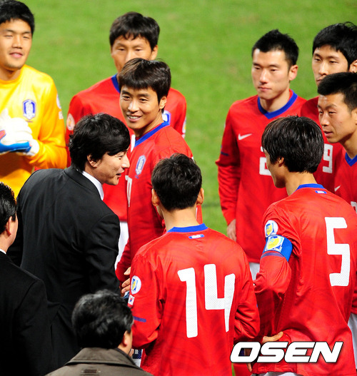 29일 오후 서울월드컵경기장에서 열린 2014 브라질월드컵 아시아지역 3차예선 최종전 대한민국과 쿠웨이트의 경기, 하프타임에 안정환이 은퇴식을 갖고 후배들과 인사를 나누고 있다.