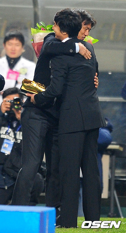 29일 오후 서울월드컵경기장에서 열린 2014브라질월드컵 아시아지역 3차예선 최종전(6차전) 대한민국과 쿠웨이트의 경기 하프타임때 안정환이 은퇴식 후 홍명보 감독에게 축하를 받고 있다