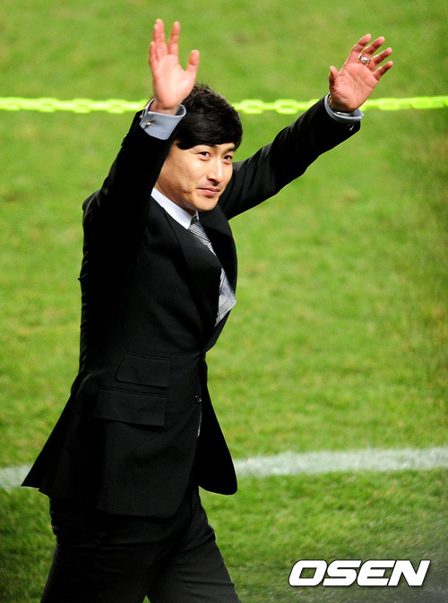 29일 오후 서울월드컵경기장에서 열린 2014 브라질월드컵 아시아지역 3차예선 최종전 대한민국과 쿠웨이트의 경기, 하프타임에 안정환이 은퇴식을 갖고 팬들에게 인사를 하고 있다.