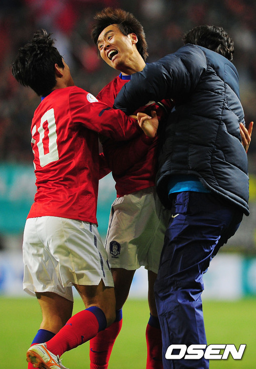 29일 오후 서울월드컵경기장에서 열린 2014브라질월드컵 아시아지역 3차예선 최종전(6차전) 대한민국과 쿠웨이트의 경기 후반 이동국이 첫골을 넣은 후 박주영과 기쁨을 나누고 있다.