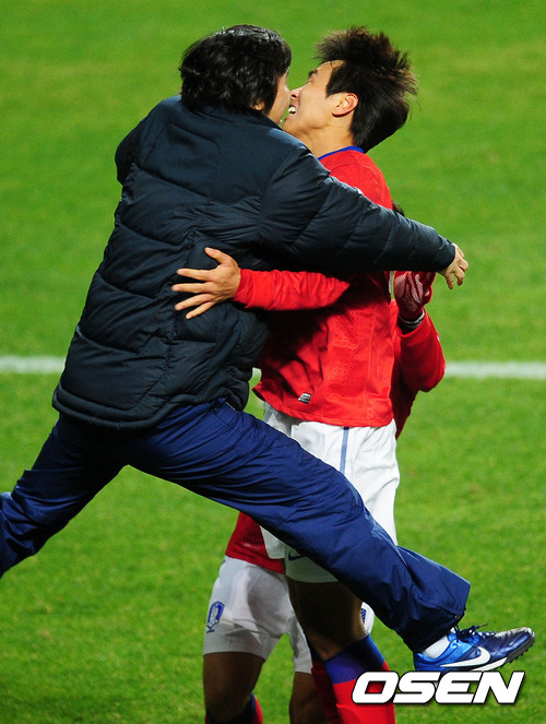 29일 오후 서울월드컵경기장에서 열린 2014 브라질월드컵 아시아지역 3차예선 최종전 대한민국과 쿠웨이트의 경기, 후반 한국 이동국이 선제골을 성공시키고 박충균 코치와 포옹하며 기뻐하고 있다.