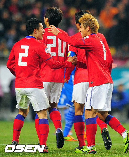 29일 오후 서울월드컵경기장에서 열린 2014브라질월드컵 아시아지역 3차예선 최종전(6차전) 대한민국과 쿠웨이트의 경기 후반 이근호가 추가골을 넣고 최효진과 기뻐하고 있다