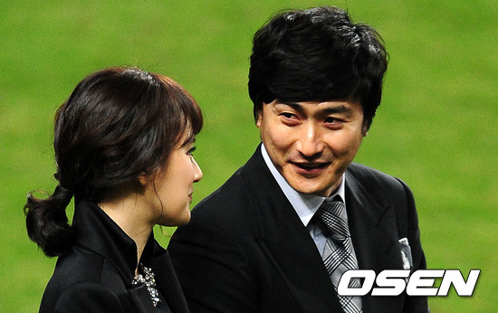 하프타임에 안정환이 부인 이혜원씨와 함께 은퇴식을 갖고 있다./ jpnews@osen.co.kr