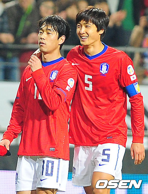경기를 마치고 박주영과 곽태휘가 기쁨을 나누고 있다./ rumi@osen.co.kr