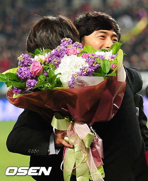 하프타임에 안정환이 은퇴식을 갖고 홍명보 올림픽대표팀 감독과 포옹을 하고 있다. / rumi@osen.co.kr