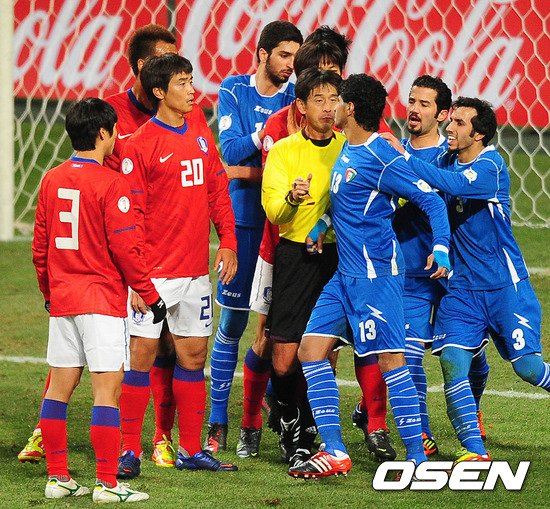 후반 한국 선수들과 쿠웨이트 선수들이 신경전을 벌이고 있다./ jpnews@osen.co.kr