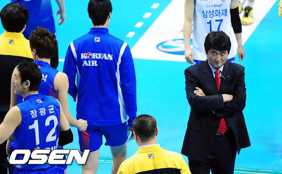 1일 오후 대전 충무체육관에서 열린 '2011-2012 NH농협 V리그' 남자부 삼성화재와 대한항공의 경기 2세트 종료 후 삼성화재 신치용 감독이 고개를 떨구고 있다.