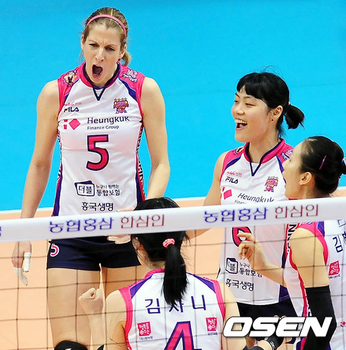 1일 오후 대전 충무체육관에서 열린 '2011-2012 NH농협 V리그' 여자부 인삼공사와 흥국생명의 경기 1세트 흥국생명이 득점에 성공하자 선수들이 환호하고 있다.