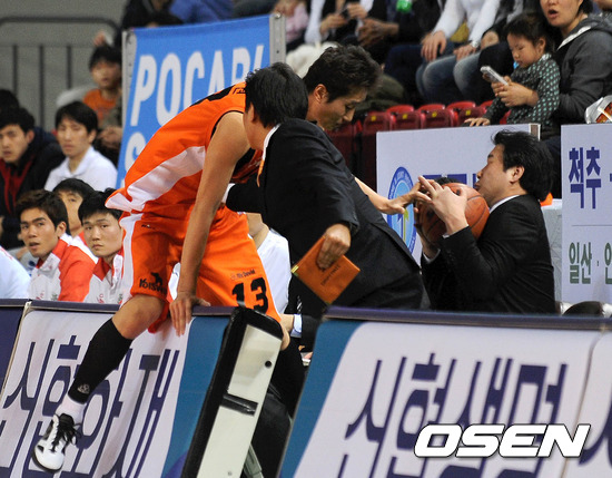 1일 오후 인천 삼산실내체육관에서 열린 '2011-2012 KB국민카드 프로농구' 인천 전자랜드와 창원 LG의 경기, 2쿼터 전자랜드 이한권이 루즈볼을 잡으려다 벤치 쪽으로 넘어지고 있다.