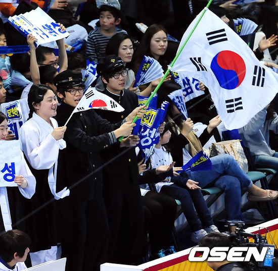 1일 오후 대전 충무체육관에서 열린 '2011-2012 NH농협 V리그' 남자부 삼성화재와 대한항공의 경기, 관중들이 태극기를 들고 응원을 하고 있다.