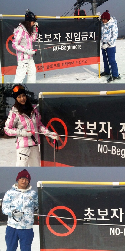 실제로 스키 초보자인 인교진과 유리아는 마치 자신들에게 하는 말인 듯 크게 적힌 초보자 진입 금지 현수막을 스키 폴대로 가리키며 설정샷을 찍어 보는 이들로 하여금 웃음을 자아내고 있다.