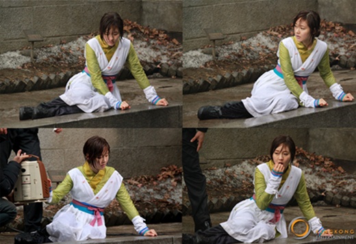 공개된 사진 속 성유리는 아리랑 수제자 복장 차림에 온 몸이 젖은 채 바닥에 쓰러져 있어 보는 이들을 안타깝게 하고 있다. 또한 휴대용 난로 앞에서 추위를 이겨내거나 입김으로 시린 손을 녹이고 있다.