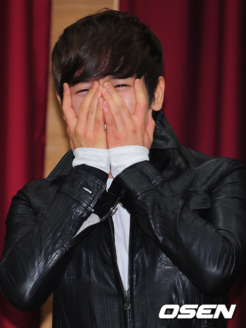 2일 오전 서울역에서 소집해제를 한 신화 멤버 가수 이민우가 한국철도공사 대강당에서 소집해제 인터뷰중 실수를 하고 쑥스러워하고 있다.