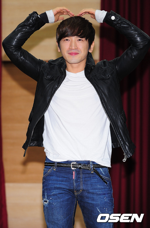 2일 오전 서울역에서 소집해제를 한 신화 멤버 가수 이민우가 한국철도공사 대강당에서 팬들에게 사랑의 하트를 날리고 있다.