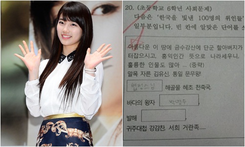 [OSEN=김경주 인턴기자] 걸그룹 미쓰에이(miss A)의 수지가 KBS 2TV 예능 프로그램 '청춘불패2'에서 치른 기초학력평가에서 '바다의 왕자'를 장보고가 아닌 박명수로 답해 웃음을 자아내고 있다.